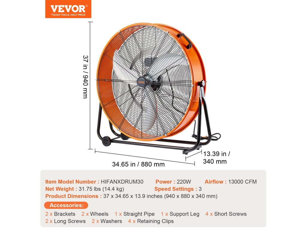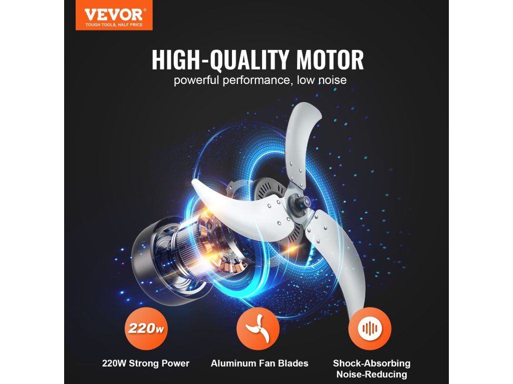 A VEVOR ipari ventilátor kiváló minőségű motorral van felszerelve, amely erőteljes légáramlást biztosít a hatékony szellőztetéshez. Speciális lapátkialakítása javítja a légmozgást, valamint erős és stabil légáramlást biztosít a friss és kényelmes munkakörnyezet érdekében.
