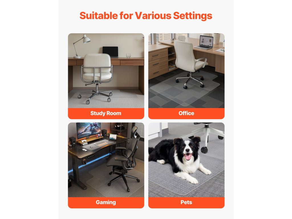 Ez az irodai székszőnyeg sokoldalú, alkalmas étkezőhelyiségekben, háziállat-zónákban vagy bármilyen olyan helyen, ahol fizikai elkülönítésre van szükség. Munkahelyi és otthoni környezetben egyaránt működik, és kényelmet és stílust kínál.