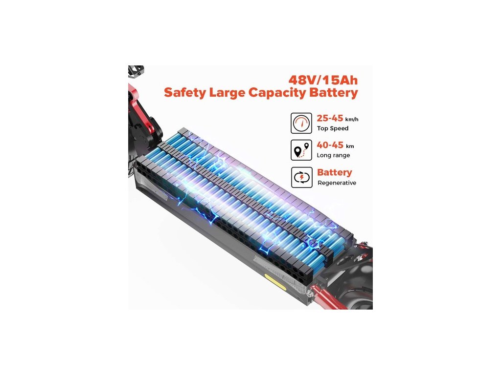 Kiváló minőségű 48V 15 Ah lítium akkumulátor, nagy teljesítmény, teljes élettartam akár 40-45 km. Az iScooter IX4 robogó kifinomult biztonsági funkciókkal rendelkezik, és véd a rövidzárlat, túláram, túltöltés, túlkisülés, túlhőmérséklet és alulfeszültség ellen.