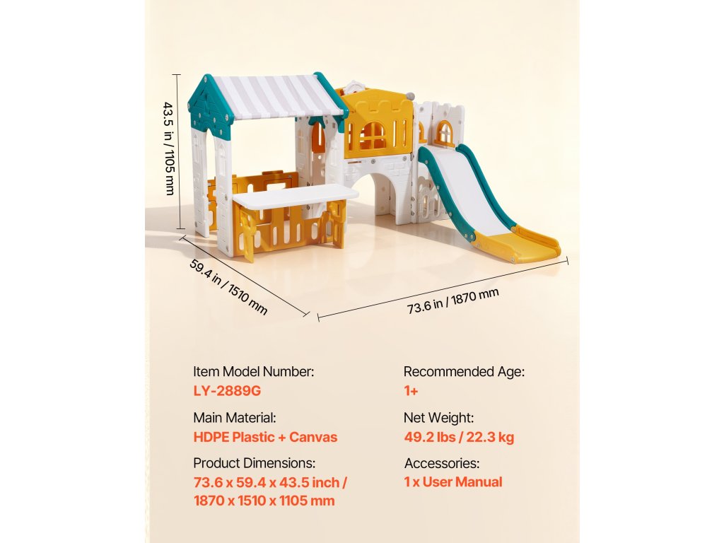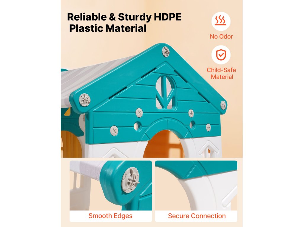A csúszdával, mászóhíddal, kosárlabdapalánkkal, kormánykerékkel, teleszkóppal és aktivitási asztallal ellátott szabadtéri játszóház a forgatókönyvek kreativitására ösztönöz. A gyerekek színlelhetik a vezetést, a bolti vezetést és az aktív játékot, így órákon át mozoghatnak és szórakozhatnak.