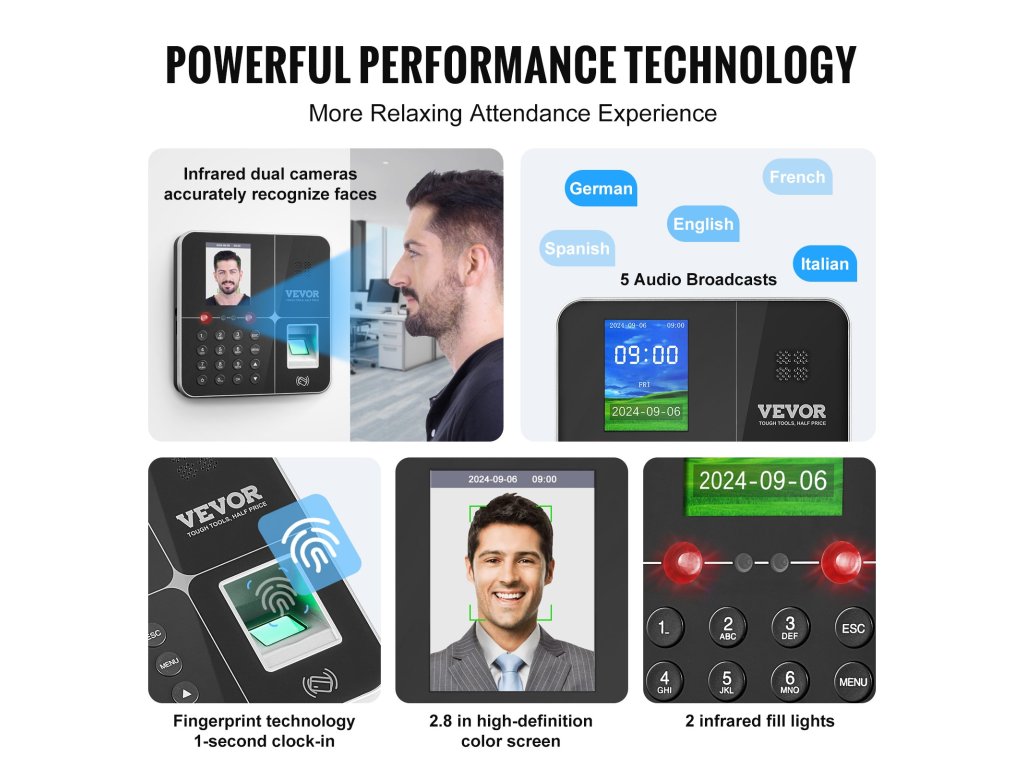 Alkalmazott munkaidő-óráink két infravörös kamerával rendelkeznek az arcfelismeréshez, intelligens algoritmusokkal, amelyek sminkkel, szemüveggel vagy sapkával is működnek, két infravörös fénnyel a gyenge fényviszonyok leküzdéséhez, valamint optikai ujjlenyomat-technológiával az 1 másodpercnél rövidebb válaszidőhöz.