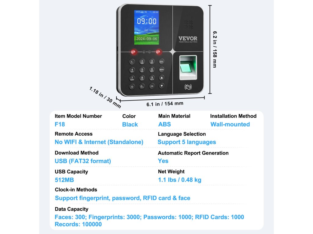 Ismerje meg a biometrikus órát, amely 4 hitelesítési móddal rendelkezik. 1000 ujjlenyomatot, jelszót és RFID-kártyát, 300 arcot és 100 000 információs rekordot képes tárolni. Egyszerű exportálás USB-ről és nincs havidíj. Az okos választás a kisvállalkozások számára.