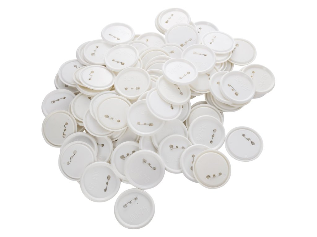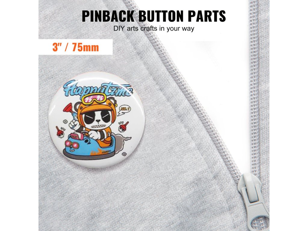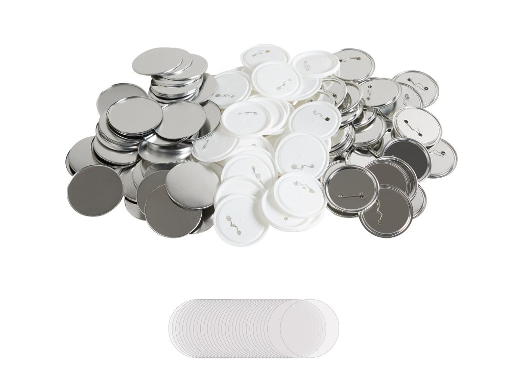 A gombok készítéséhez szükséges alkatrészek átmérője 3 hüvelyk/75 mm.Összesen 200 készlet; Minden készlet tartalmaz egy fedelet, fóliát és alját (műanyag és fém).