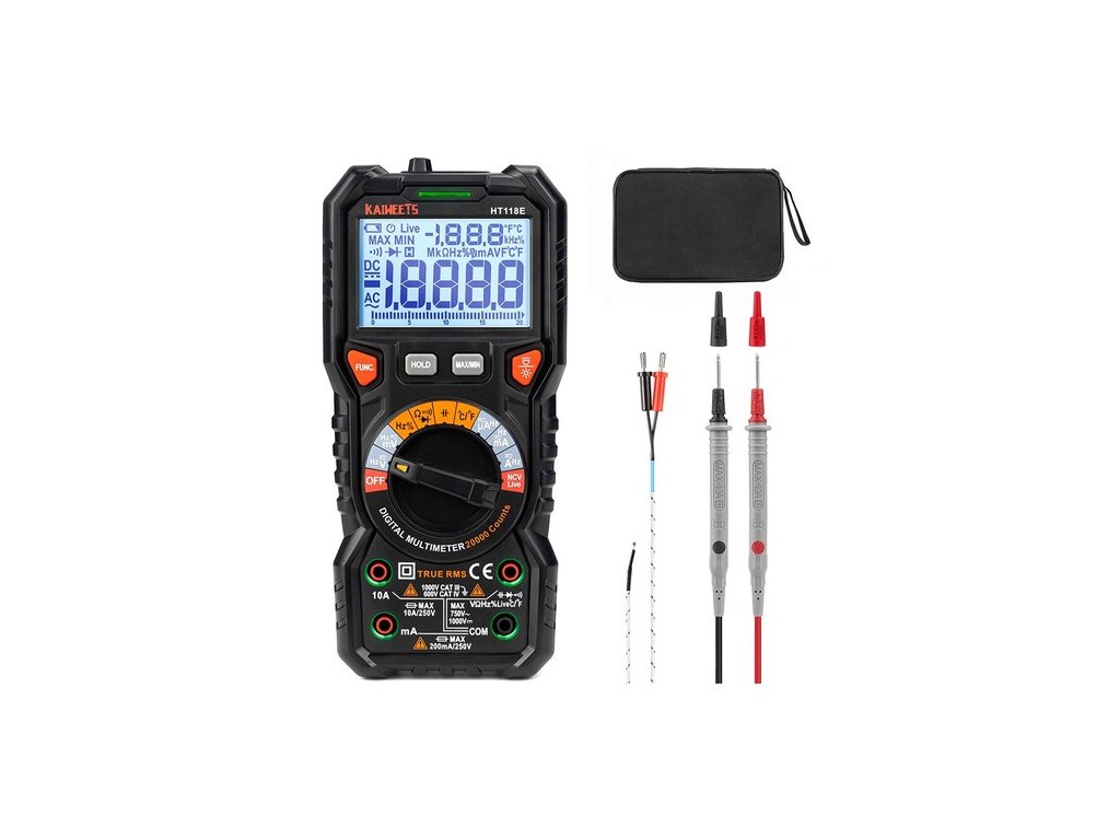 | A csomag tartalma: | KAIWEETS HT118A multiméter, mérővezetékek, K-típusú hőelem, AA elemek, csomagolódoboz, használati útmutató |