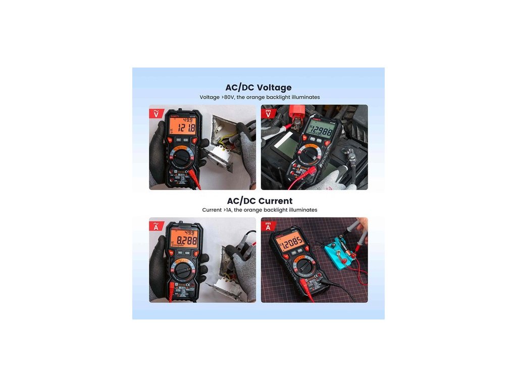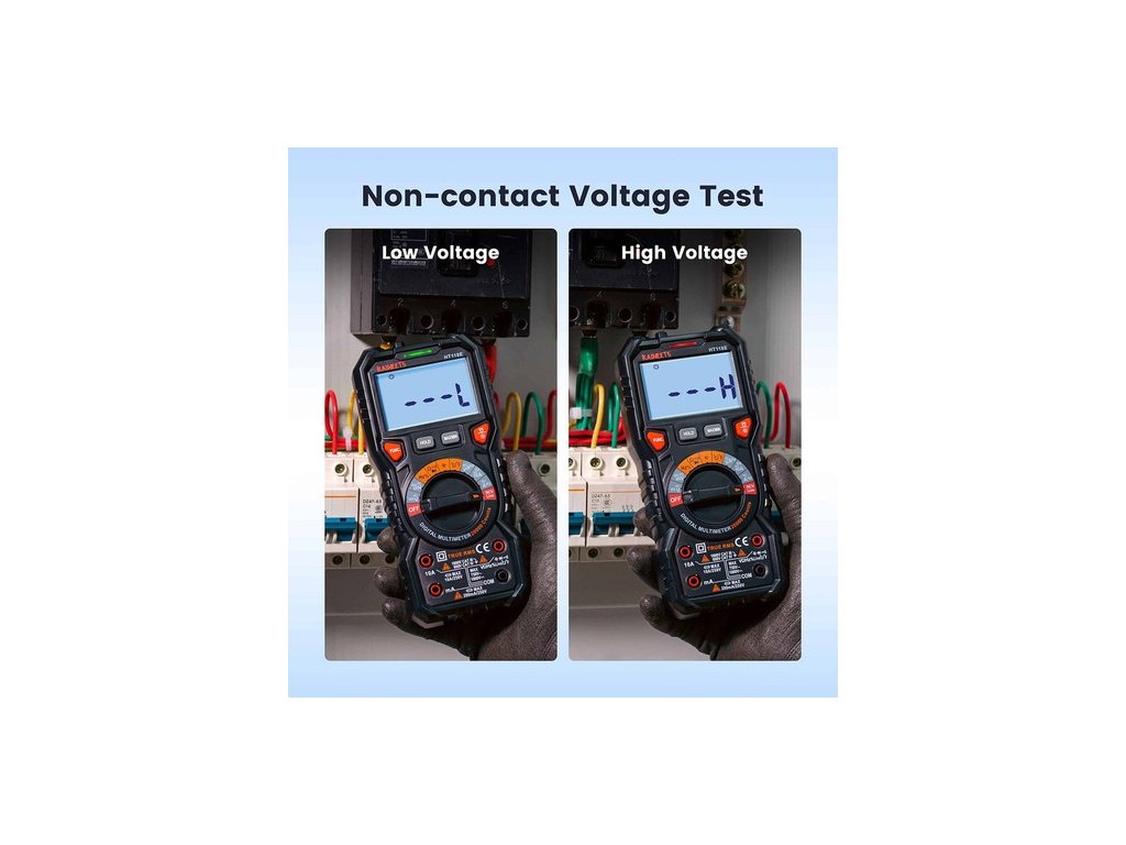 A HT118E digitális multiméter pontosan képes mérni az AC/DC feszültséget, AC/DC áramot, ellenállást, hőmérsékletet, kapacitást, frekvenciát, munkaciklust, diódákat, folytonosságot és NCV-t, feszültség alatti értékeket hang- és fényjelzéssel. Alkalmas háztartási konnektorok, biztosítékok, akkumulátorok (beleértve a járműveket is), autóipari áramkörök hibaelhárítására, töltőrendszerek, autóipari elektronika tesztelésére stb.
