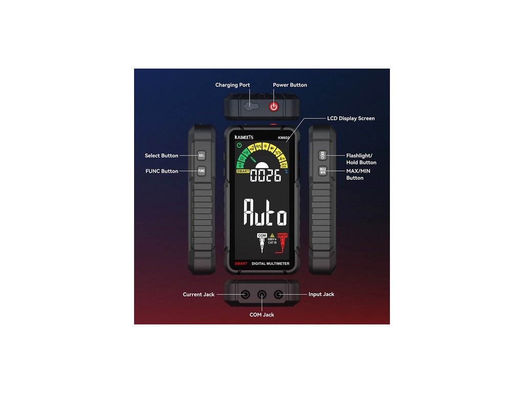 A KAIWEETS KM602 intelligens multiméter alapértelmezés szerint intelligens üzemmódba kapcsol. Smart módban a feszültségmérő automatikusan méri a feszültséget, az ellenállást és a folytonosságot. Képes azonosítani a mérési tartalmat és kiválasztani a legjobb felbontású tartományt, így a mérés kényelmesebbé és gyorsabbá válik.