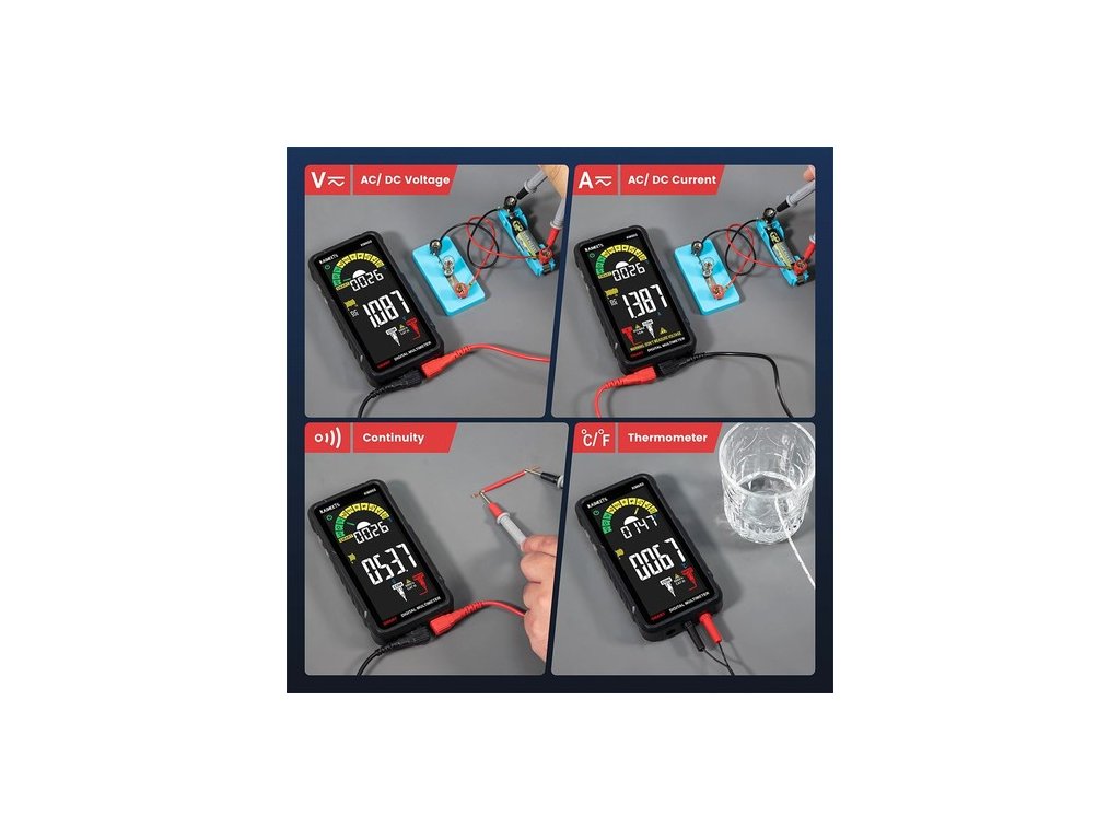 Alkalmas elektromos problémák diagnosztizálására autóipari, ipari és háztartási alkalmazásokban. A multiméter pontosan képes mérni a váltakozó és egyenfeszültséget, ellenállást, folytonosságot, váltakozó és egyenáramot, kapacitást, frekvenciát, diódát, üzemciklust, hőmérsékletet, NCV-t és feszültség alatt álló vezetőt.