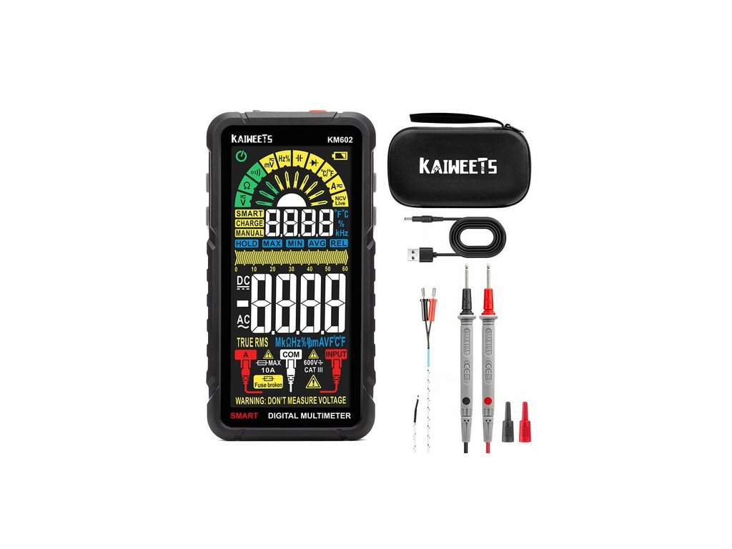 | A csomag tartalma: | 1 x töltőkábel, 1 x Bőr tok, 1 x méteres táska, 1 x piros és fekete mérőkábel, 1 x hőelem, 1 db KAIWEETS KM602 multiméter |