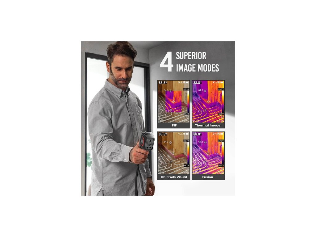Infravörös kameránk 4 képmódot kínál - infravörös, látható fény, fúzió és kép a képben -, hogy részletes képhatásokat biztosítson a különböző felhasználási forgatókönyvek kielégítésére. 6 színpaletta, így kiválaszthatja a munkájához ideális színskálát. Ideális otthoni vizsgálatokhoz, hiányzó szigetelésekhez, légszivárgásokhoz, vízkárokhoz, épületkarbantartáshoz, HVAC hibaelhárításhoz, valamint elektromos és mechanikai rendszerek professzionális vizsgálatához!