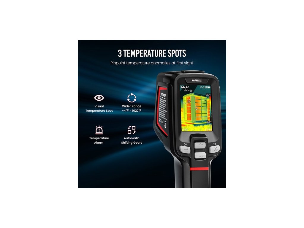 KAIWEETS KTI-W02 PRO hőkamera ultra-nagy felbontású 256×192, a legújabb SharpIR kompozit képjavító technológiával, piacvezető képi tisztasággal, a megfigyelés világosabb és intuitívabb; hőérzékenység ≤ 45 mk, hőmérsékleti felbontás akár ±1 ° F, hőmérsékleti hiba ±2 ° C vagy ±2%, így a mérési eredmény pontosabb lehet, és a problémák diagnózisa megbízhatóbb.