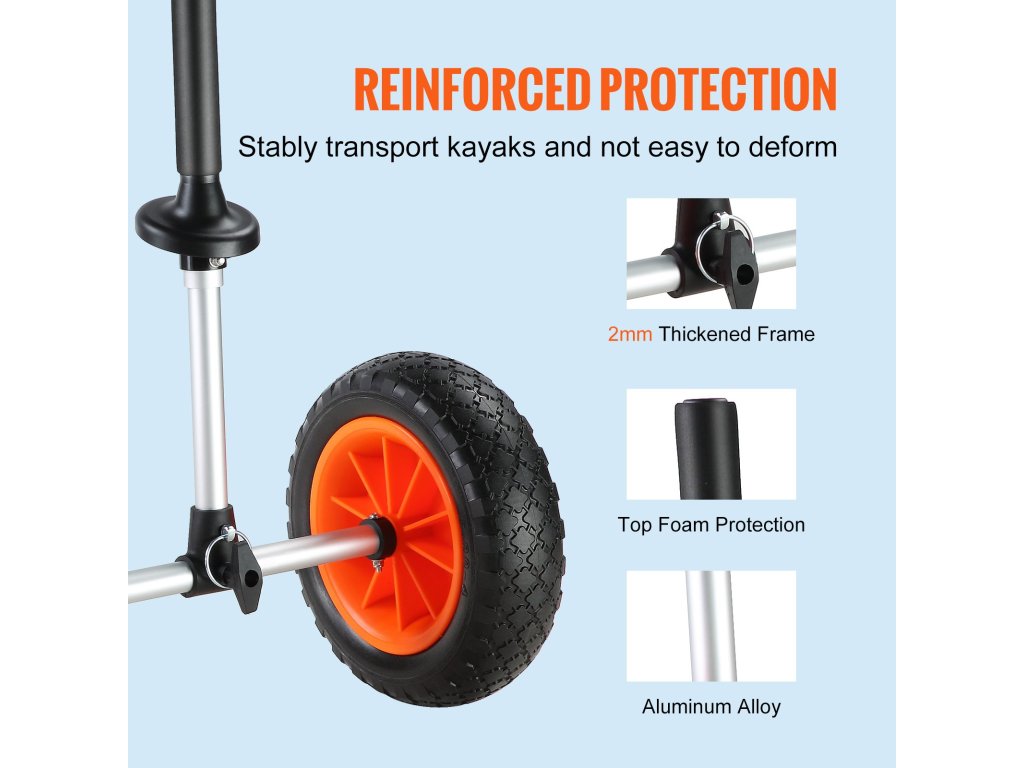 Jednou z najlepších vlastností ťažkého kajakárskeho vozíka VEVOR sú jeho pevné pneumatiky. Vozík na kanoe VEVOR je skonštruovaný tak, aby vydržal. Je vybavený pevnými pneumatikami z PU, ktoré sa nespustia, ani keď zostanú na kajaku na uskladnenie. Vďaka tomu bude vozík vždy pripravený na použitie. Konštrukcia z hliníkovej zliatiny je pevná a zároveň ľahká. Tento vozík zvládne nosnosť až 280 kg. Je vhodný pre väčšinu kajakov. S týmto kajakárskym vozíkom môžete bez obáv prepravovať svoj kajak bez toho, aby ste sa museli obávať údržby pneumatík alebo životnosti vozíka. Pevné pneumatiky a robustná konštrukcia robia z tohto vozíka spoľahlivú voľbu pre všetky vaše vodácke potreby.