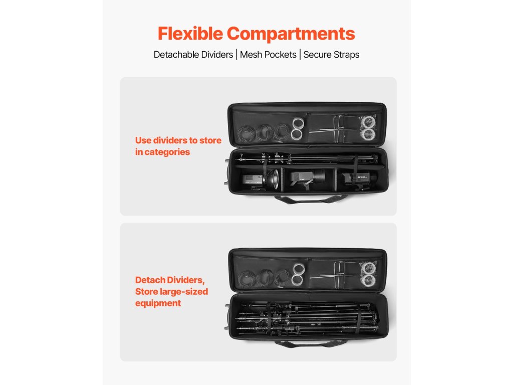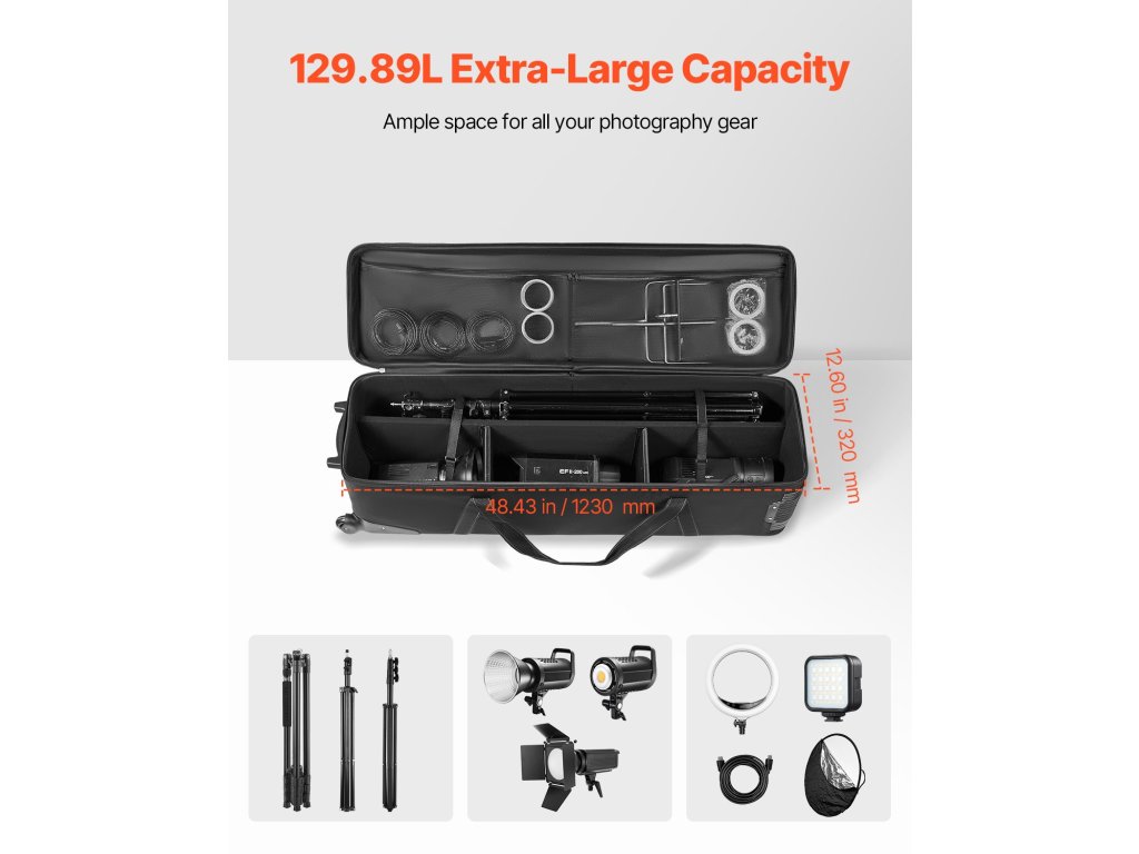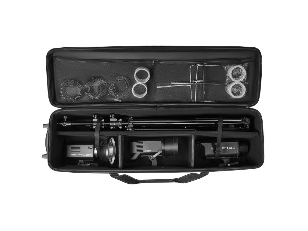 Kifejezetten a különböző méretű fotófelszerelések tárolására tervezett, kerekes stúdióbőröndünk könnyedén tárolja a stúdiófényeket, fényállványokat, puha fényű esernyőket és összecsukható reflektorokat. Tökéletes társ a fotósok számára.