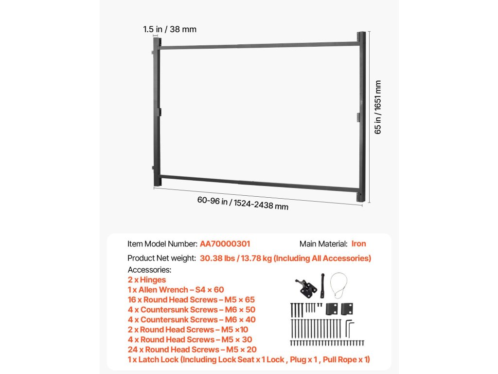 | Termék méretei (H x Sz x Ma) | (60-95,98) x 2,24 x 65 hüvelyk / (1524-2438) x 57 x 1651 mm |