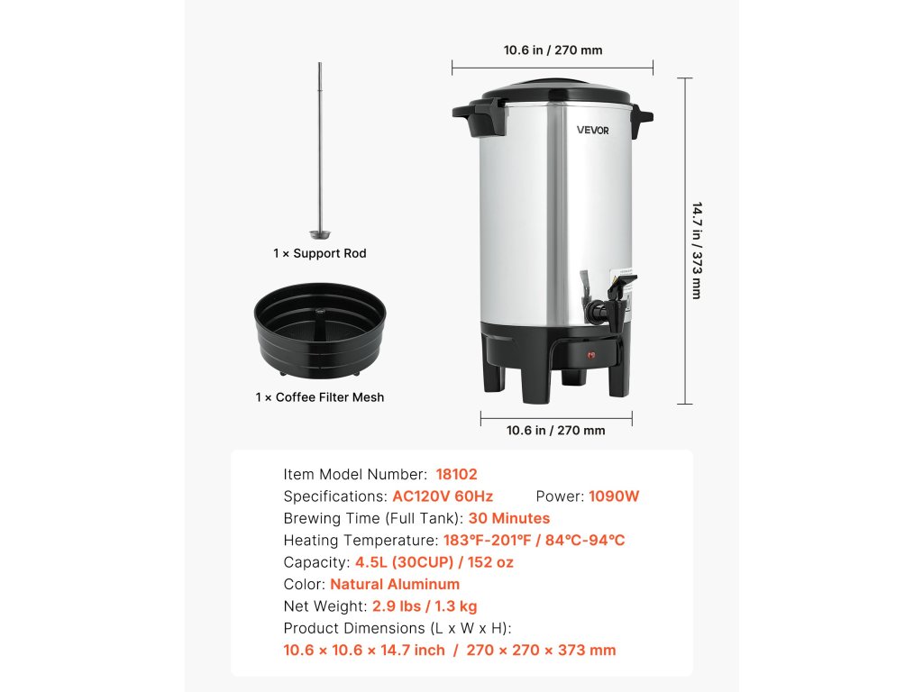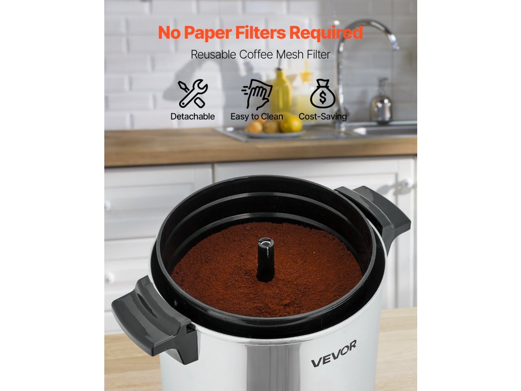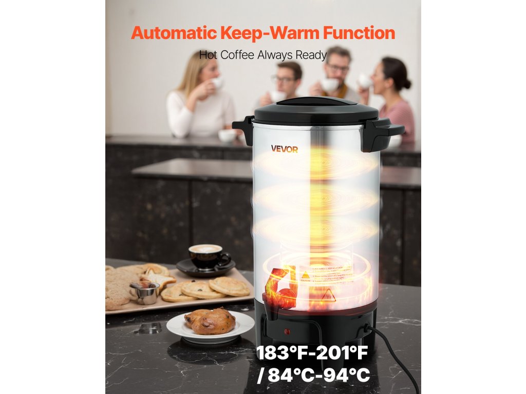 Ez az urna gyors felmelegedést, tartós szigetelést és cseppmentes dupla csapot kínál. Az újrahasználható hálós szűrő könnyen tisztítható és költségkímélő. Szárazforralás elleni védelemmel, hűvös tapintású fogantyúkkal és tartós testtel tervezték, így ideális éttermekbe, irodákba és bankettekbe.