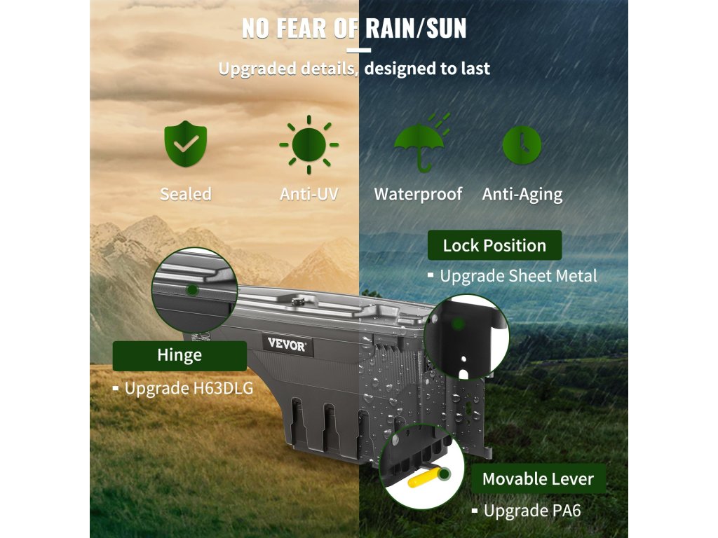 Az ABS teherautó-ágyazati szerszámosládánk nagy teherbírású konstrukcióval rendelkezik, hogy ellenálljon a szélsőséges időjárási körülményeknek. Az esőnek nincs esélye ezzel a tervezett hőre lágyuló műanyaggal szemben. Tartósan készült, így Ön hosszú éveken át elégedettséget tapasztalhat.