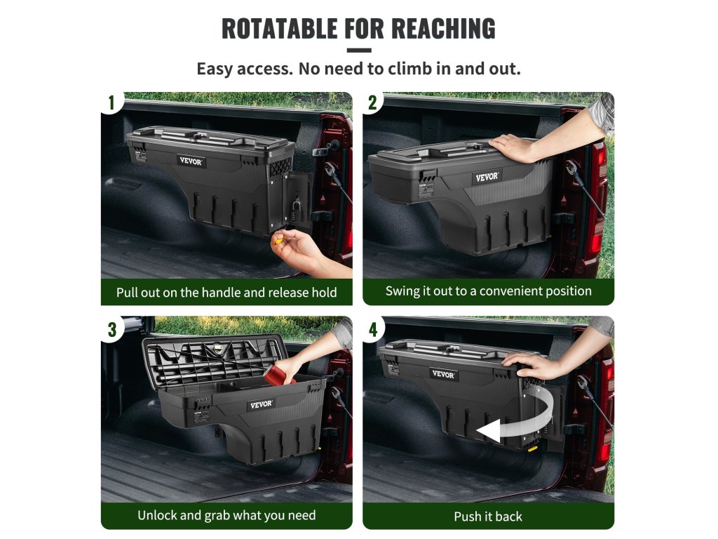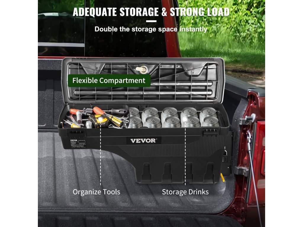 A teherautó platóján elhelyezett tároló doboz a teherautó vezető- vagy utasoldalán is elhelyezhető, így rengeteg helyet biztosít az utazási igényekhez. Kényelmesen ki- és becsúsztatható. Nem kell bemászni az ágyba, ahogyan azt a legtöbb doboz megköveteli.