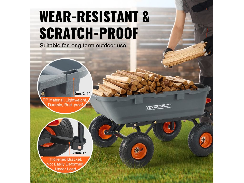Ez a robusztus, vastag fémvázzal ellátott kerti kocsi akár 800 kg súlyt is elbír. Bőséges kapacitása minden szállítást gyerekjátékká tesz.