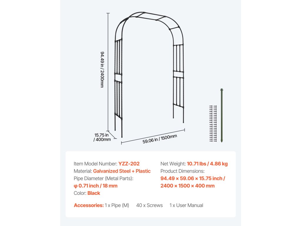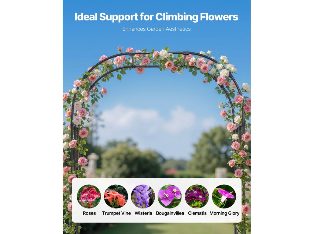 Ez a kerti boltív fokozza kertje esztétikáját, és különböző kertészeti stílusokhoz illeszkedik. Horganyzott acélcsőből készült, T-csuklókkal megerősítve a szélállóság érdekében. Mérete 94,5 x 59 hüvelyk, így tágas és ideális mászó növények, valamint esküvői, ünnepi és rendezvénydekorációk számára.