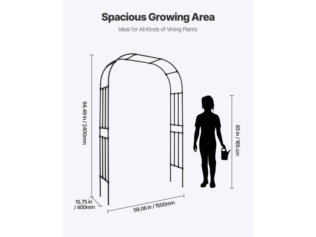 Ez a 94,5 x 59 hüvelyk méretű ív nagyméretű kúszónövények, például borostyán, szőlő és golgotavirág befogadására alkalmas, javítva a növények mászásának hatékonyságát és létrehozva egy függőleges zöld kert kialakítását.