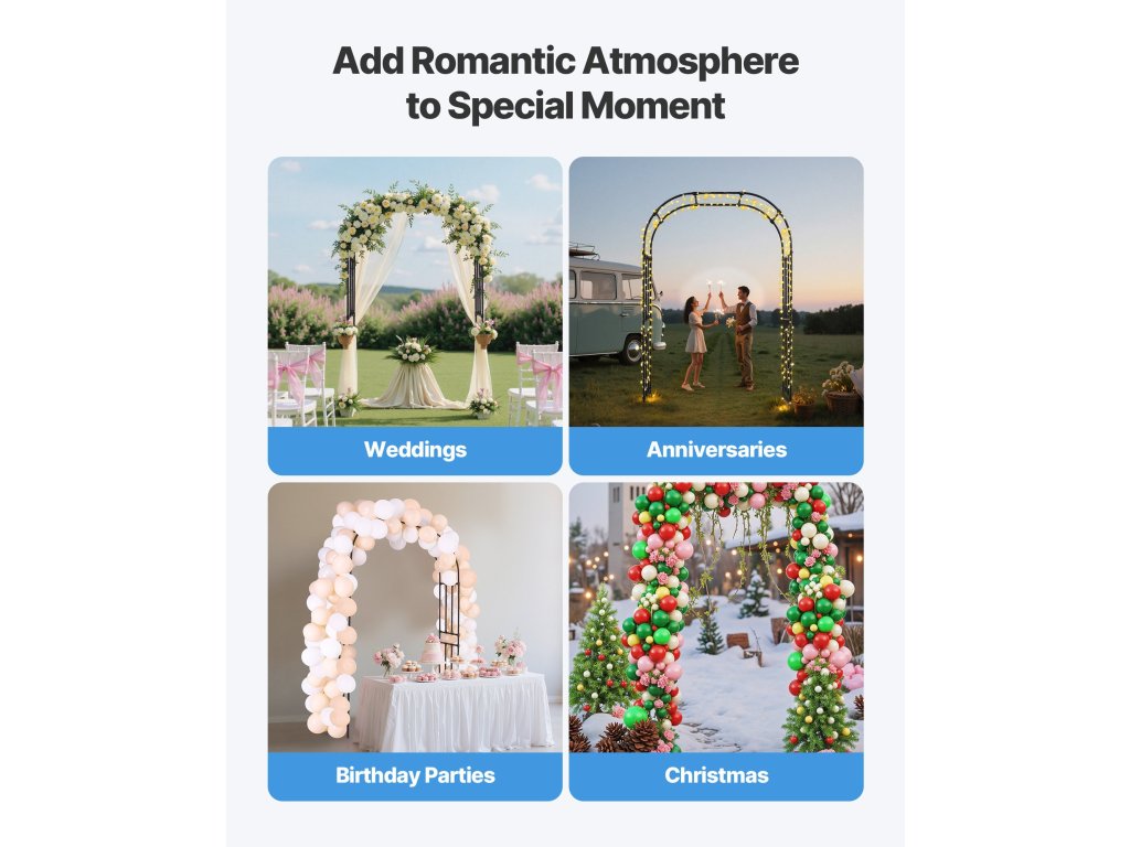 Esküvői boltívünk nem csak a növények alátámasztására szolgál, hanem alkalmas virágok, lufik, fények és egyéb dekorációk felakasztására is. Ideális esküvőkre, partikra vagy ünnepségekre, ahol romantikus hangulatot és maradandó emlékeket teremt. Egyszerre funkcionális és gyönyörű dekoratív boltív.
