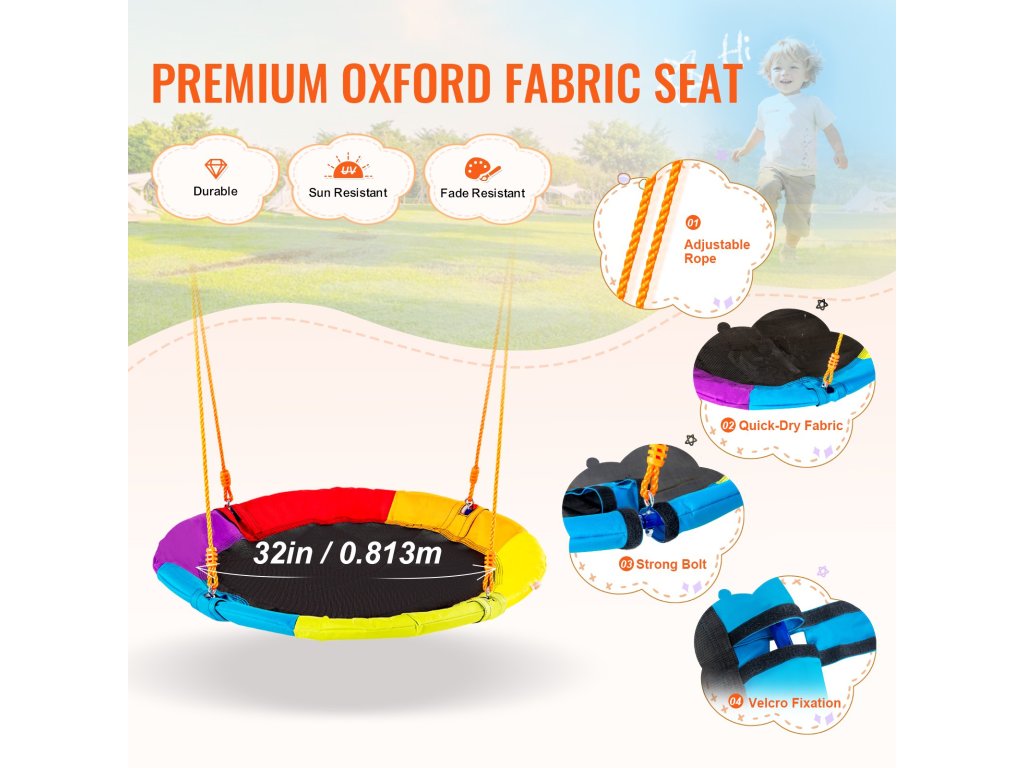 A hintaszett teljes felépítése masszív, erős kötelekkel a stabil hintázás érdekében. A horganyzott acél biztonsági zárak ellenállnak a rozsdának és a korróziónak, ami növeli a tartósságot. A kiváló minőségű oxfordi szövetből készült ülés kopásálló, a 4 földbe szögezett szög pedig extra stabilitást biztosít.