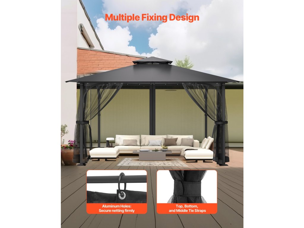 A tetején lévő alumínium rögzítőfuratoknak köszönhetően ez a pavilonernyő stabilabb és tartósabb, mint a hagyományos poliészter szövetek. A kampókkal és gyűrűkkel kombinálva könnyen felszerelhető és biztonságosan rögzíthető a pavilon keretéhez, így rendben és rendben tartja a szabadtéri teret.