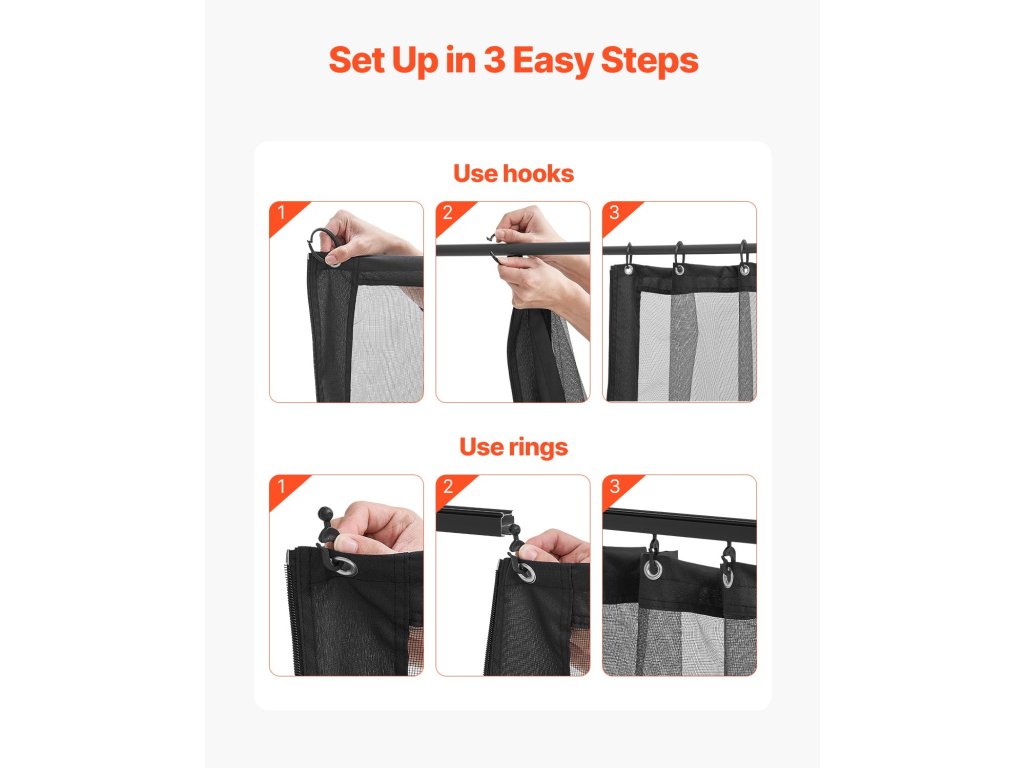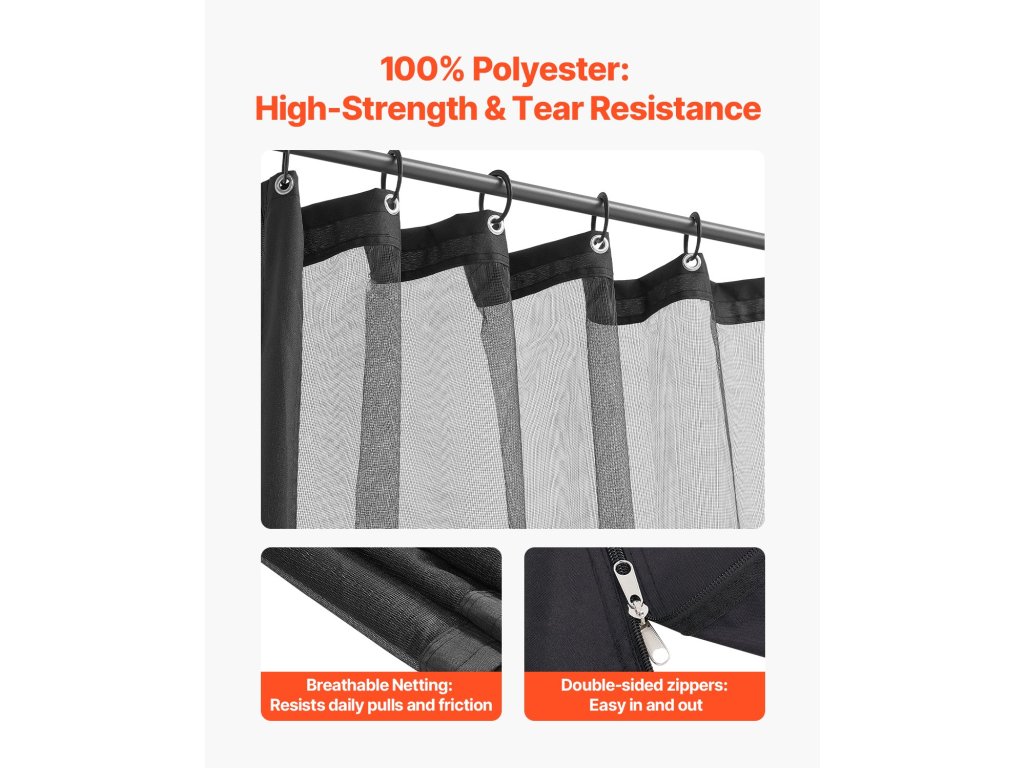 Ez a pavilonháló 10 × 13 × 6,8 láb méretű pavilonokhoz alkalmas, és 100%-ban szakadásálló poliészterből készült. Hatékonyan blokkolja a legyeket és biztosítja a magánéletet. A biztonságos rögzítéshez alumínium rögzítőfuratokkal, kampókkal és gyűrűkkel rendelkezik. Gépben mosható a könnyű tisztítás és tárolás érdekében. Megfordítható cipzár a további kényelem érdekében.