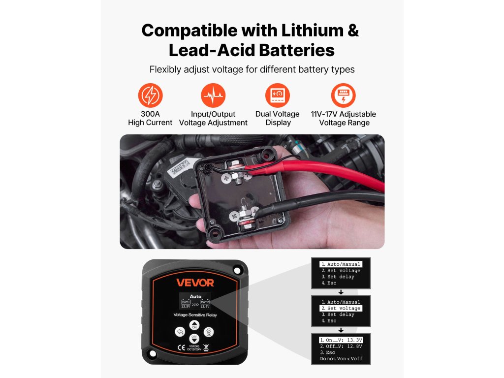 A kettős akkumulátor leválasztó automatikusan beállítja a töltési feszültséget a különböző akkumulátortípusoknak megfelelően. Széles körben kompatibilis a különböző lítium- és ólom-sav akkumulátorokkal, biztosítva a különböző típusú akkumulátorok hatékony működését.