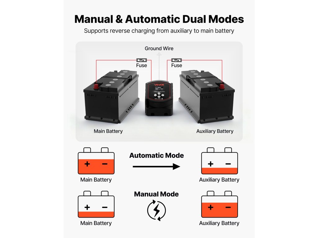 Kifogyott az áram az indítóakkumulátorból? Ne aggódjon! VSR leválasztónk kézi üzemmódba kapcsolható, és egy teljesen feltöltött másodlagos akkumulátort használ a fordított töltéshez. Lehetővé teszi, hogy indítókábel nélkül indítsa be a motort, és pillanatok alatt újra az úton lehessen!