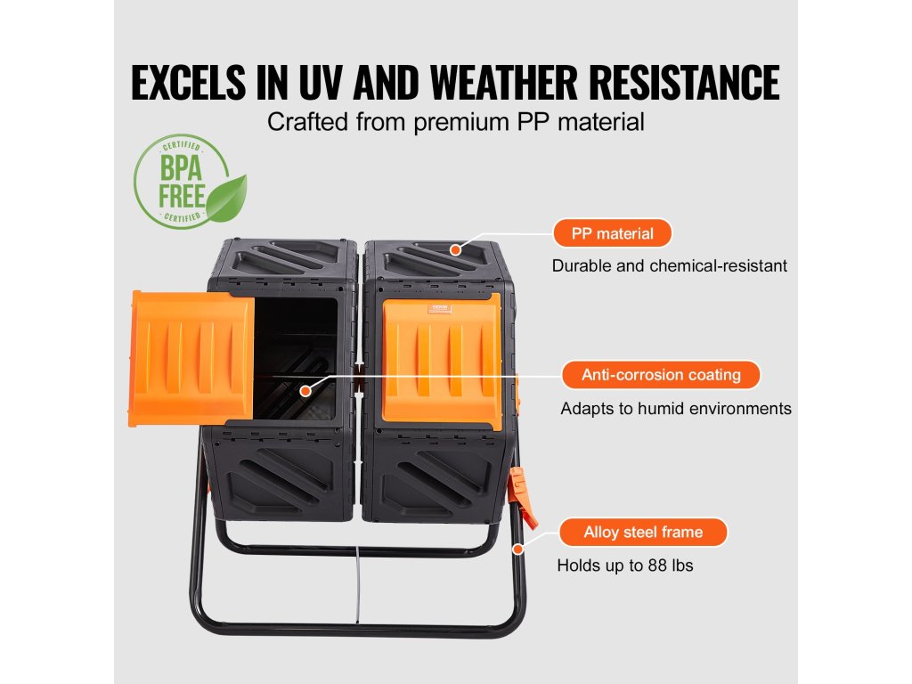 Komposztáló kotrógépünk két független kamrával rendelkezik, amelyek egymástól függetlenül 360°-ban forognak; nincs szükség kézi keverésre. A különböző szakaszokban történő egyidejű komposztálással és a rendszeres forgatással a legjobb komposztálási eredmény érhető el. Élvezze a példátlan kényelmet a kertészkedés során.