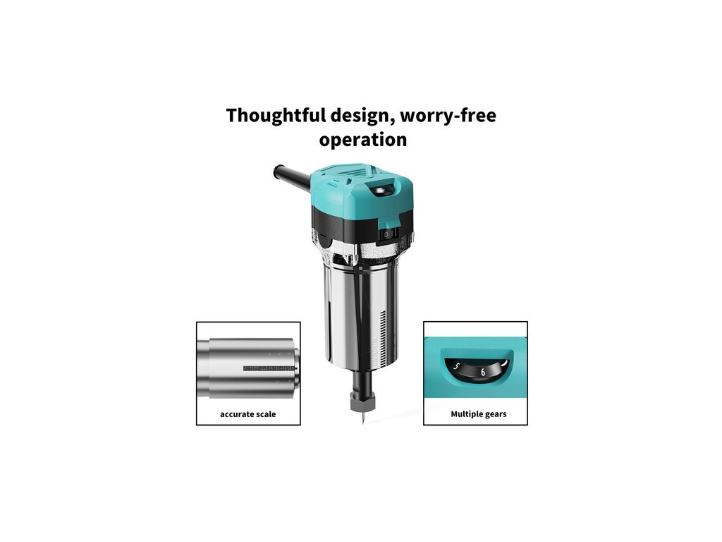 A precíz sebességszabályozó gomb segítségével 6 sebességfokozat közül választhat 10 000 és 30 000 fordulat/perc között. Ez a sokoldalúság megfelel a különböző összetett folyamatok követelményeinek, így a részletes famegmunkáláshoz nélkülözhetetlen eszközzé válik.