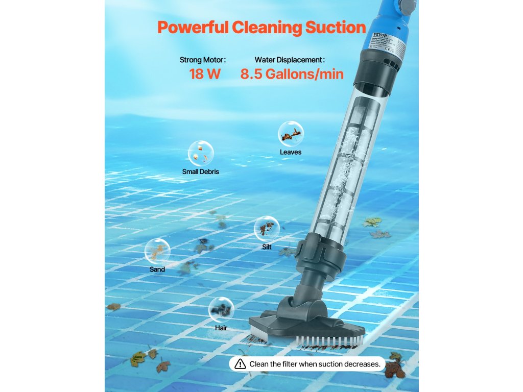 Ez a vezeték nélküli pezsgőfürdőporszívó nagy teljesítményű, 18 W-os motorral és 8,5 g/perc áramlási sebességgel rendelkezik, amely hatékonyan távolítja el a szennyeződéseket, homokot és törmeléket a medence aljáról (kivéve az algákat).