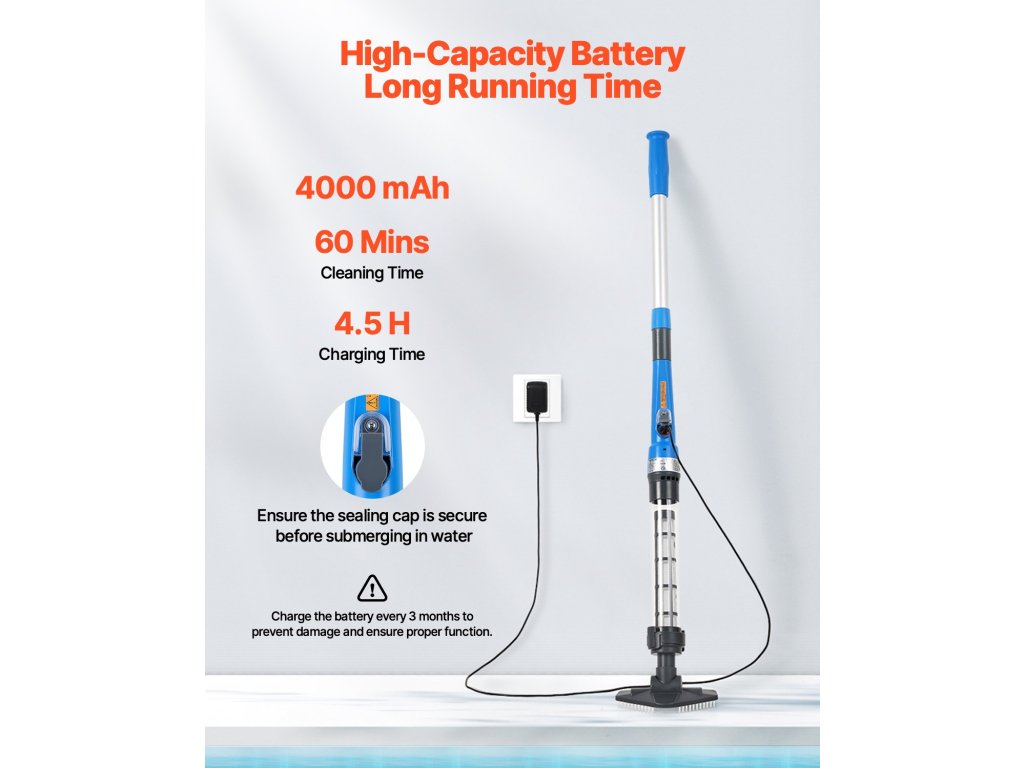 Beépített 4000 mAh-s akkumulátorával ez az újratölthető medenceporszívó akár 60 perces üzemidőt biztosít egy teljes feltöltéssel, így bőven elegendő időt biztosít az egész medence megtisztítására a tápkábelekkel való bajlódás nélkül.
