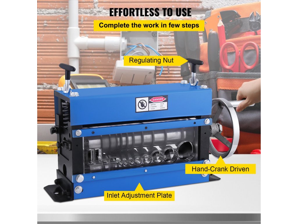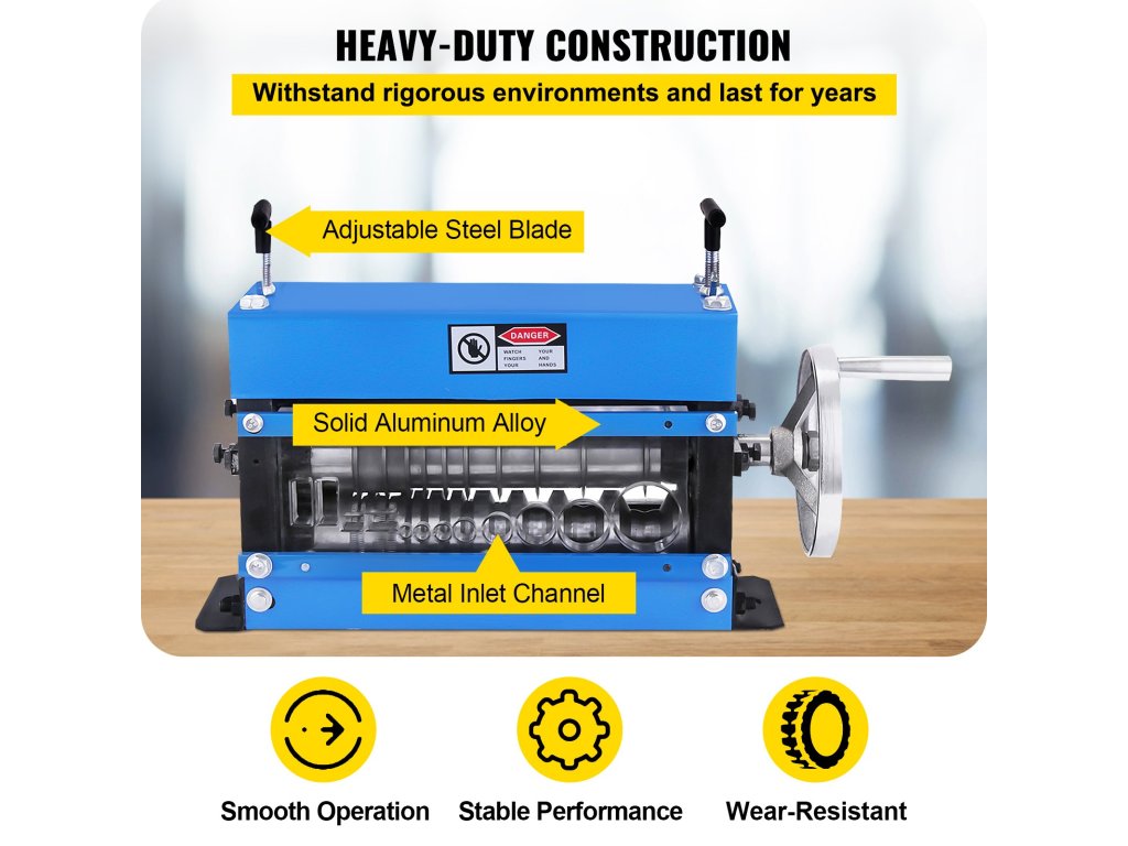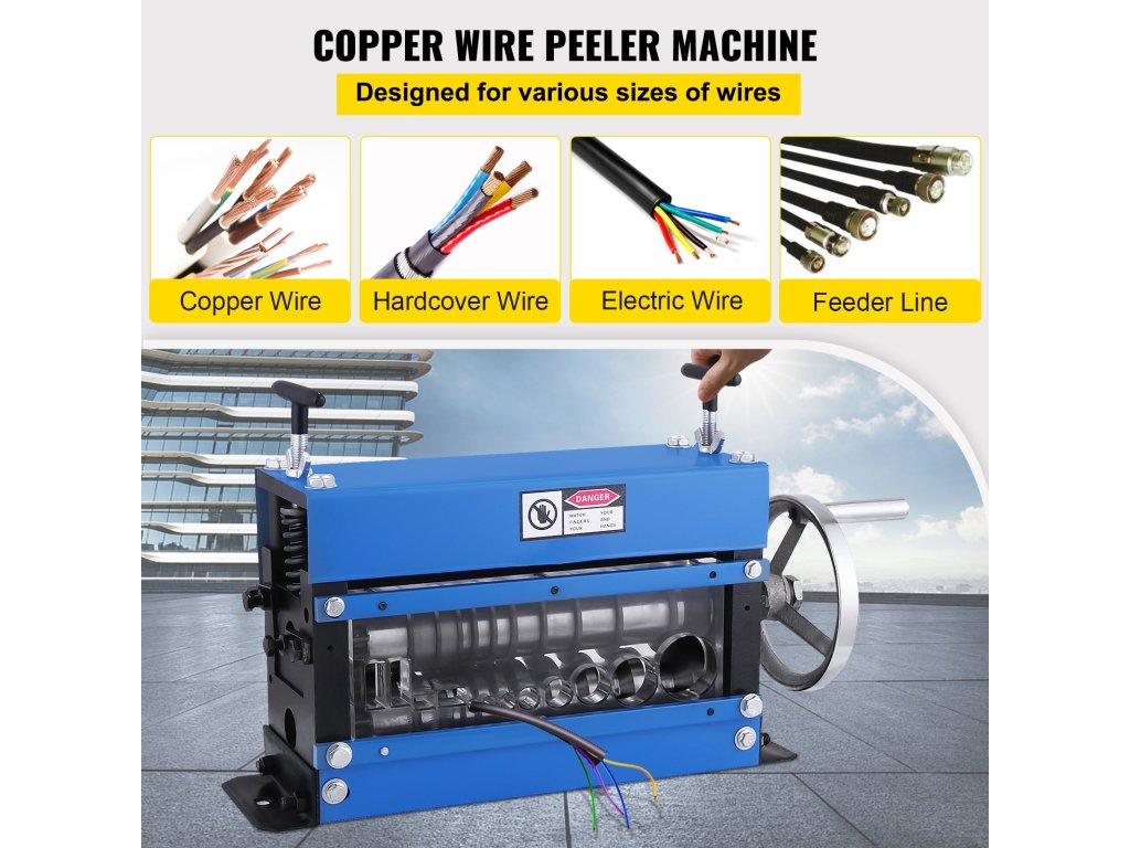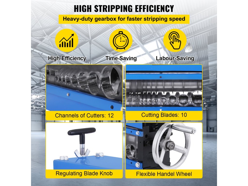Prémium kategóriás kábelcsíkozó gépünk 4 lapos nyílással és 8 kerek csatornával rendelkezik a hulladék rézhuzal lecsíkozásához, és alkalmazkodik a különböző méretű huzalokhoz.