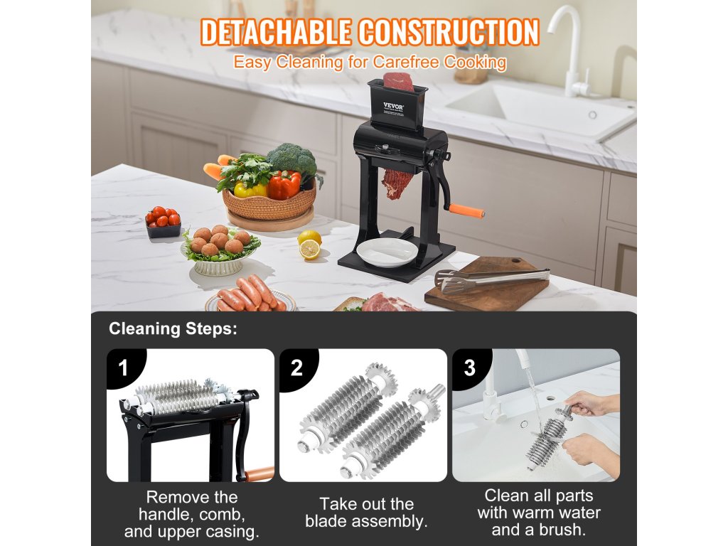 Ez a húsklopfoló 31 éles és precíz 420 rozsdamentes acélból készült pengével, 420 élelmiszeripari minőségű rozsdamentes acélból készült pengekagylóval és optimalizált kagylóelhelyezéssel rendelkezik, amelyek megakadályozzák a hús megroppanását, gyorsabban puhítják a húst, és jelentősen növelik a hatékonyságot a kereskedelmi konyhákban.