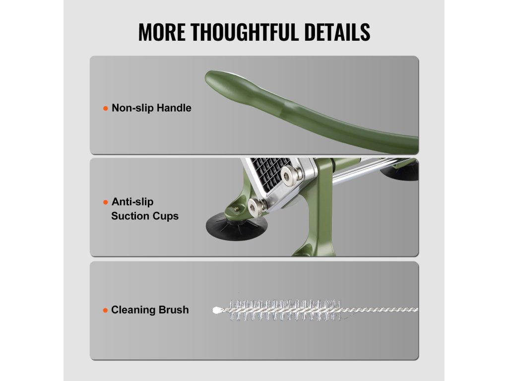 Éles pengékkel és ergonomikus karral felszerelt, 4 csúszásmentes tapadókoronggal a jobb stabilitás érdekében. Az erőteljes szívóerő biztosítja a csúszásmentességet működés közben. Könnyedén szeletelhet vele zöldségeket, például burgonyát, sárgarépát, uborkát, sőt még a keményebb fajtákat, például édesburgonyát is.