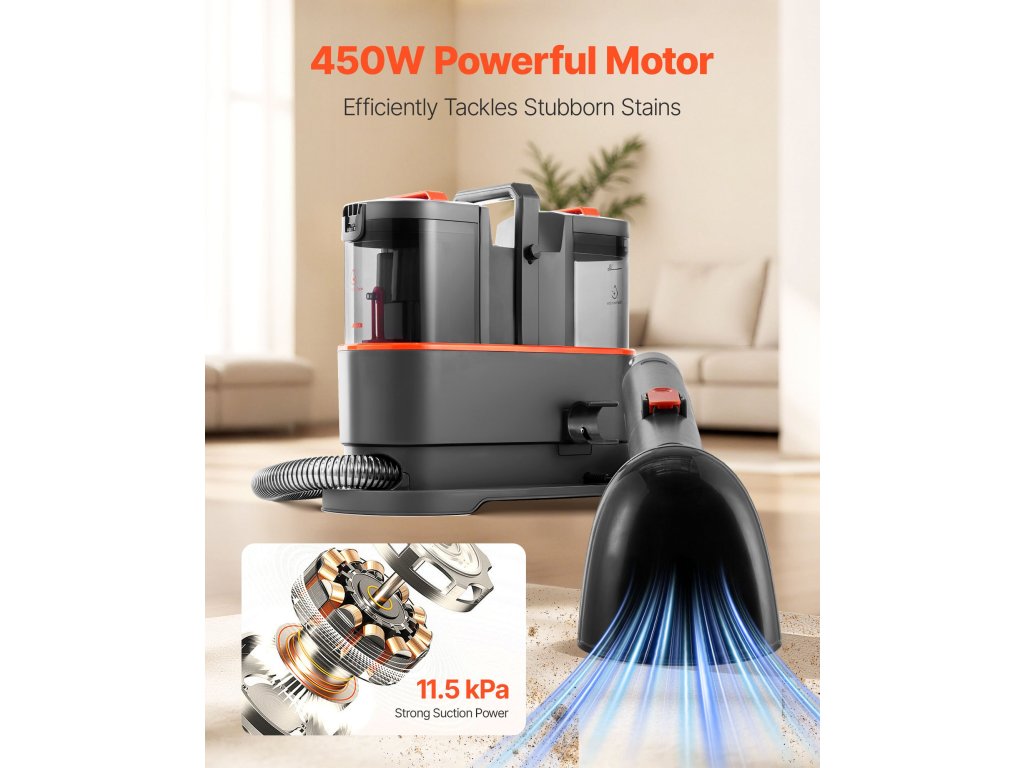 A hordozható szőnyegtisztító erőteljes tisztítást kínál felhasználóbarát kialakításban. A 450 W-os motorja 11,5KPa szívóerőt biztosít az egész ház megtisztításához. Tartalmaz 2 speciális kefét: egy szőnyegkefét és egy résszerszámot. Mindössze 9,33 kg-os súlyával könnyen mozgatható. Szőnyegeit 3 gyors lépésben tisztítjuk meg - egyszerűen és hatékonyan.