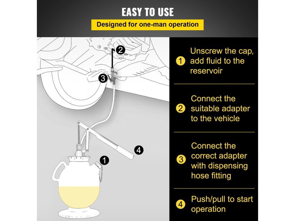 Csavarja le a kupakot, töltsön folyadékot a tartályba, és csatlakoztassa a megfelelő adaptert a járműhöz. Ezután csatlakoztassa a megfelelő adaptert az adagolótömlő csatlakozójához. Nyomja meg/húzza meg a művelet elindításához.