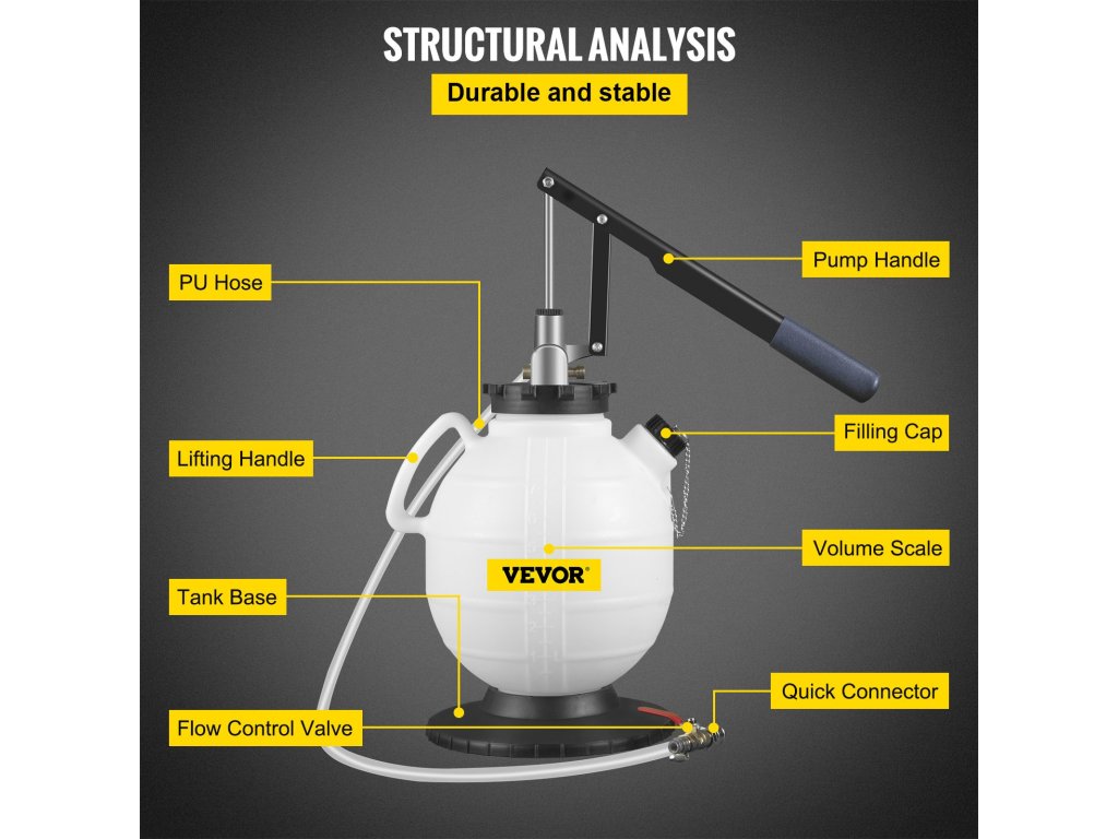 A sebességváltó folyadék nyomáscsökkentő berendezésünk vastag műanyag tartályt tartalmaz, és nagy, 7,5 literes űrtartalommal rendelkezik. Úgy terveztük, hogy könnyebben és gyorsabban adagolhassa a váltófolyadékot anélkül, hogy rendetlenséget okozna.