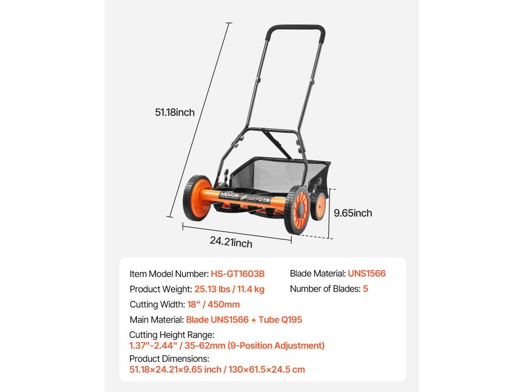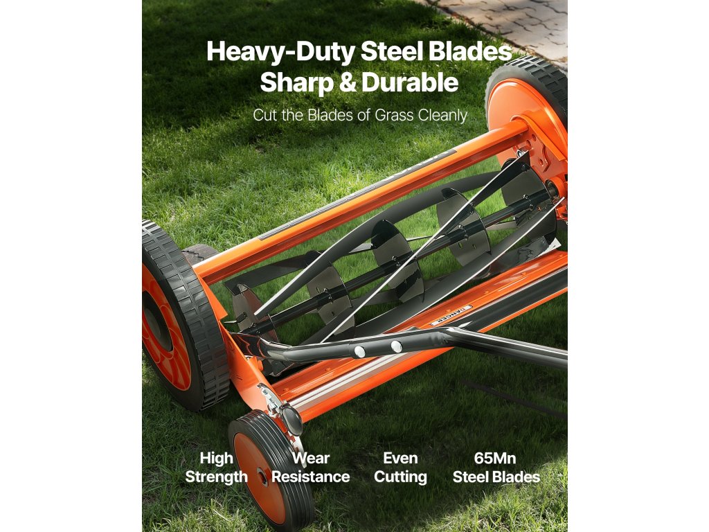 Ez a 18 hüvelykes kézi fűnyíró öt késsel, 65 Mn acélból készült, precíz és egyenletes vágást biztosít a kis és közepes méretű gyepek számára. Az állítható magasságú kialakítás alkalmazkodik a különböző fűfajtákhoz, a 4 nagy kerék és a szivacsos fogantyú pedig csökkenti a fűnyírási erőfeszítéseket. A mellékelt fűgyűjtő zsák megkönnyíti a tisztítást.