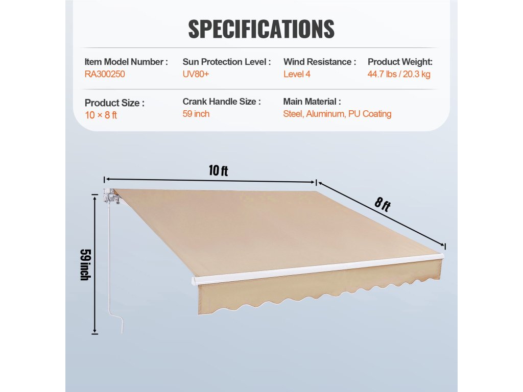 Ezt a kézzel behúzható napellenzőt vastag acélcsövek tartják, amelyek stabilitást biztosítanak és ellenállnak a szélnek a 4. szintig. Az alumínium görgő és a szövet szilárd tartást biztosít, megakadályozva a megereszkedést és a meghajlást.