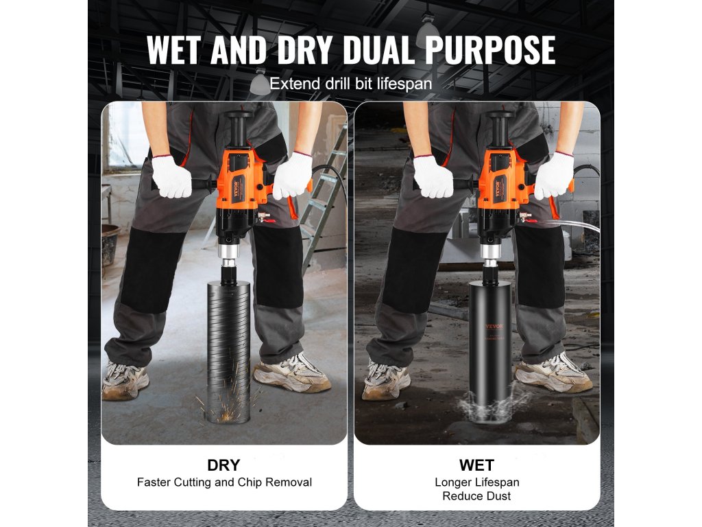Tapasztalja meg a kiváló vágási sebességet és a törmelék eltávolítását a száraz vágási módnak köszönhetően. A nedves vágási üzemmód csökkenti a por és a túlmelegedés mértékét munka közben, növelve a biztonságot és a kényelmet a munkakörnyezetben. Emellett segít csökkenteni a szerszámkopást, meghosszabbítva ezzel a magfúrógép élettartamát.