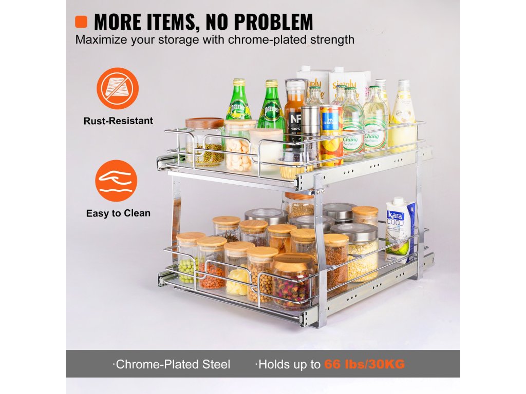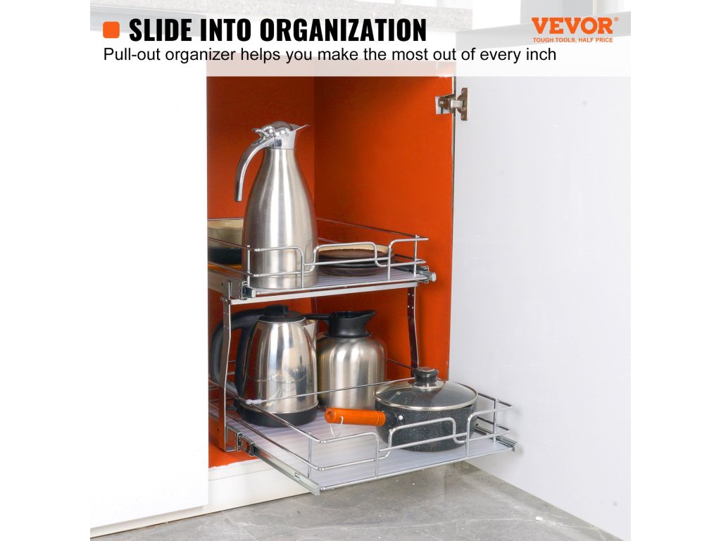Výsuvný organizér do skrine VEVOR je vyrobený zo silnej pochrómovanej ocele. Zakaždým poskytuje hladkú a spoľahlivú prevádzku. Výsuvy s guľôčkovými ložiskami zabezpečujú bezproblémové posúvanie zásuviek. Vďaka tomu je prístup k vašim predmetom jednoduchý a pohodlný. Pevná konštrukcia. Organizér zvládne veľké zaťaženie. Nemusíte sa obávať, že sa bude kývať alebo rozbije. Použité materiály sú vysoko kvalitné, čo zvyšuje odolnosť. Vďaka tejto bezproblémovej prevádzke je jeho každodenné používanie príjemné. Je efektívnym riešením na usporiadanie vašej kuchyne alebo kúpeľne.