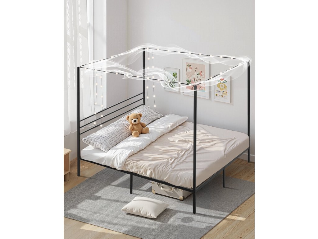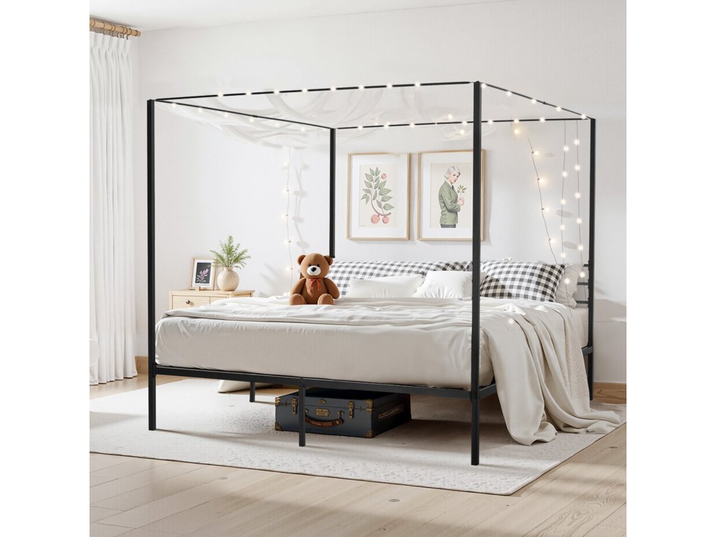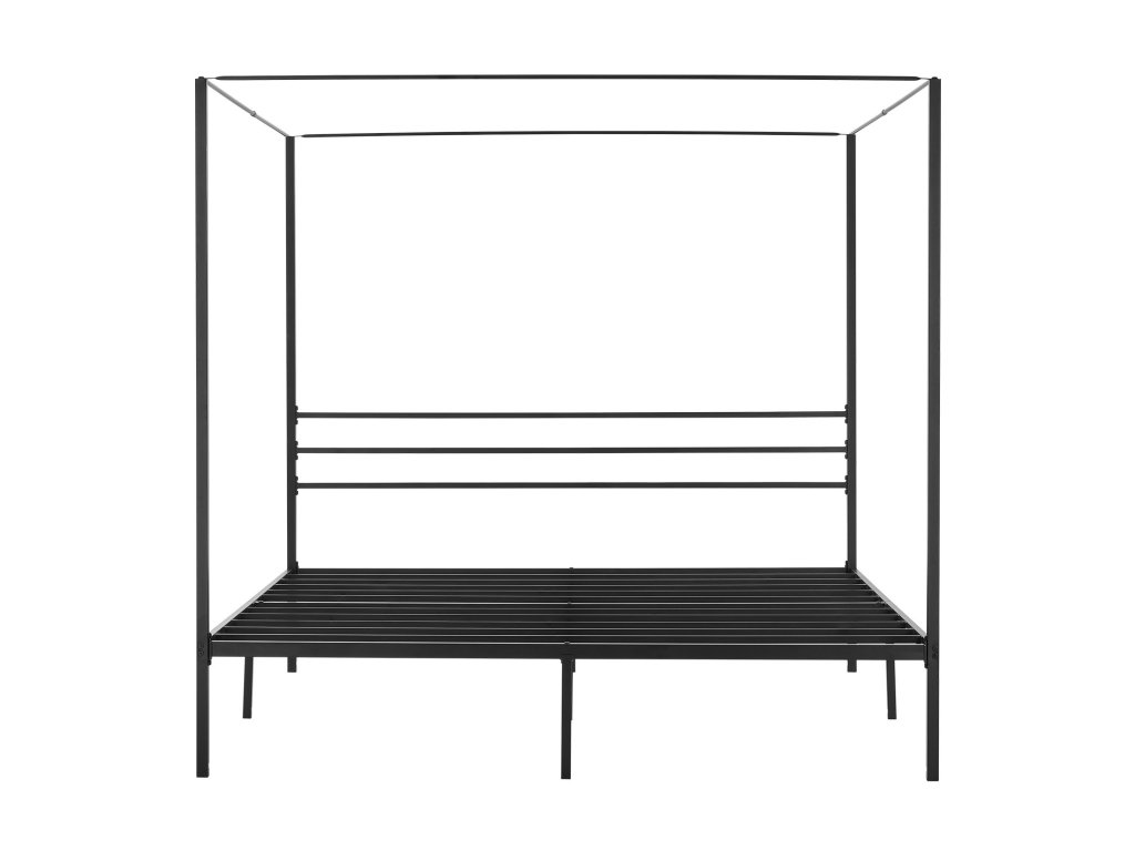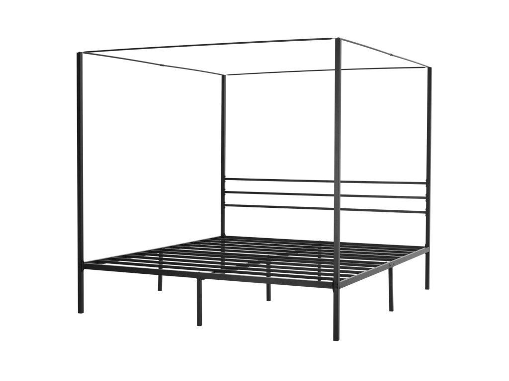 King size ágykeret baldachinnal, fém, 4 oszlop, lécek, fekete