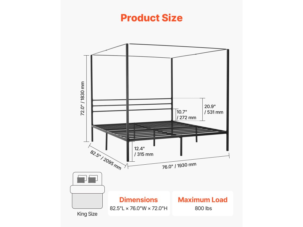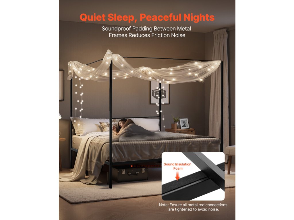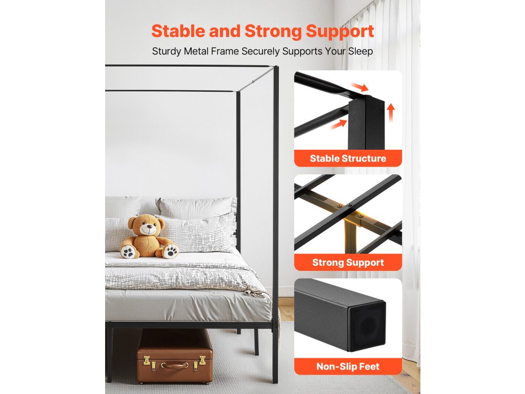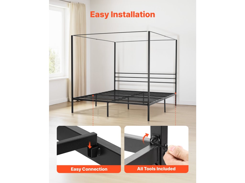 King size ágykeret baldachinnal, fém, 4 oszlop, lécek, fekete