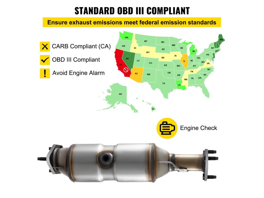 A közvetlenül felszerelhető katalizátor megfelel az OBD III szabványoknak, de nem felel meg a CARB szabványoknak. Így a legtöbb államban használható, kivéve Kaliforniában, de nem használható olyan járművekben, amelyeknek meg kell felelniük a kaliforniai kibocsátási előírásoknak.