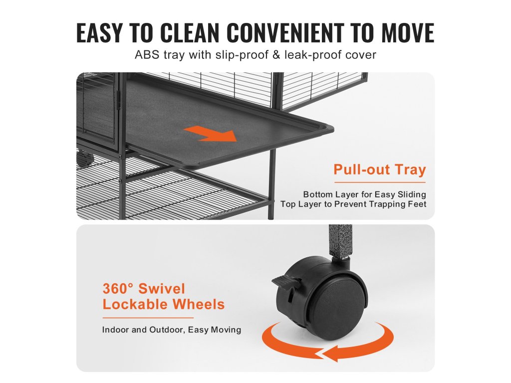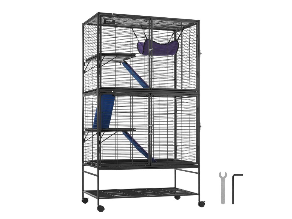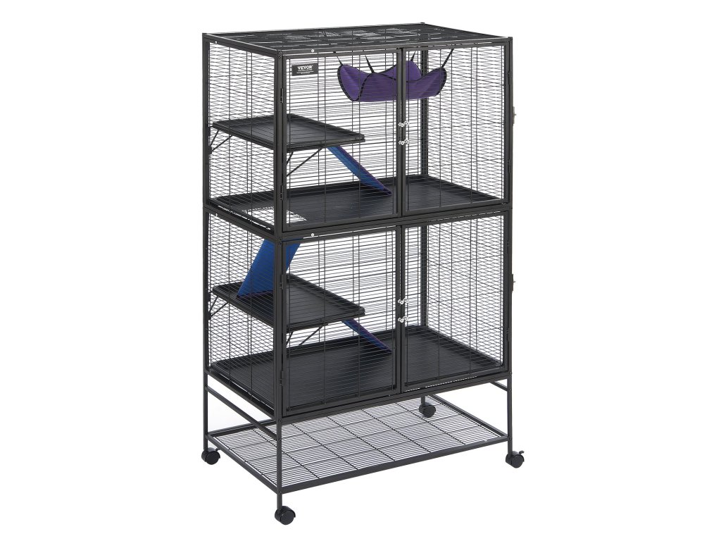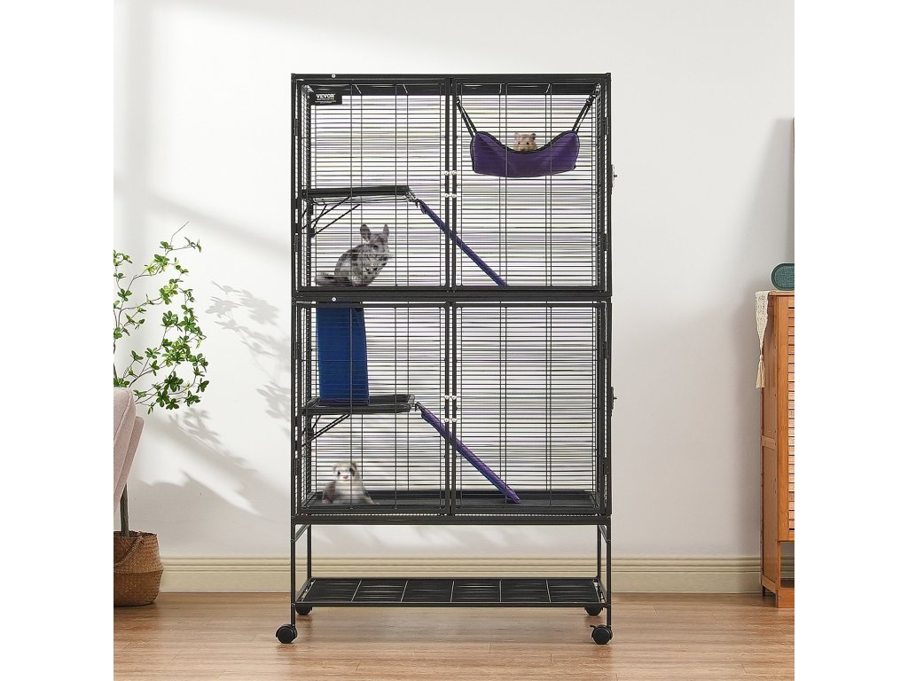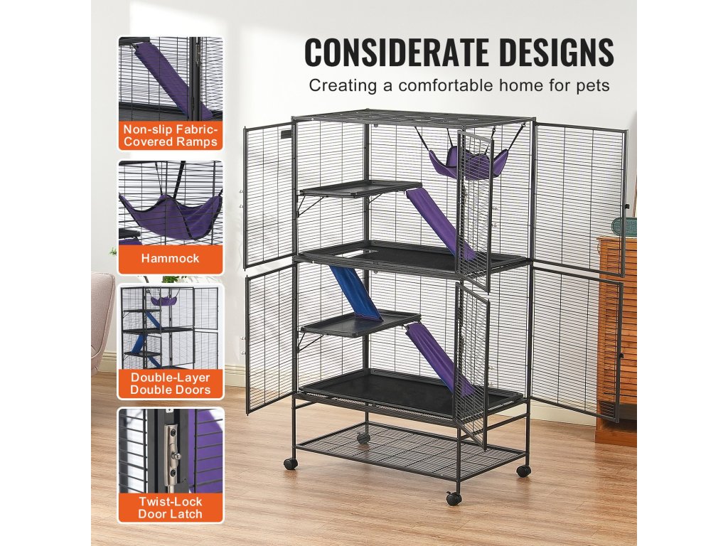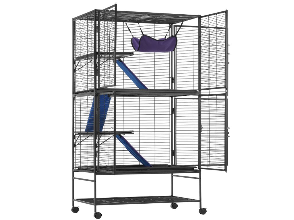 A 3 csúszásmentes rámpával és 4 platformmal ez a kisállat ketrec könnyű hozzáférést biztosít a kis állatok számára. A flanelborítású rámpák biztonságos lábtartást biztosítanak, a függőágy pedig változatosságot teremt. A dupla ajtók és a felső ablak kényelmes etetést tesznek lehetővé. A zárható görgők biztosítják a könnyű mobilitást beltéren és kültéren egyaránt.