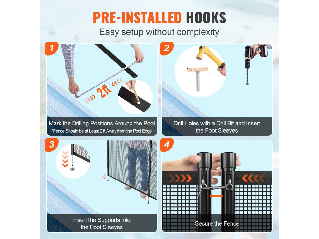 A levehető medencekerítés lehetővé teszi, hogy a nem szakemberek is könnyen és gyorsan összeszerelhessék, szétszerelhessék és tárolhassák. Alkalmas cement- és betonburkolatokhoz.