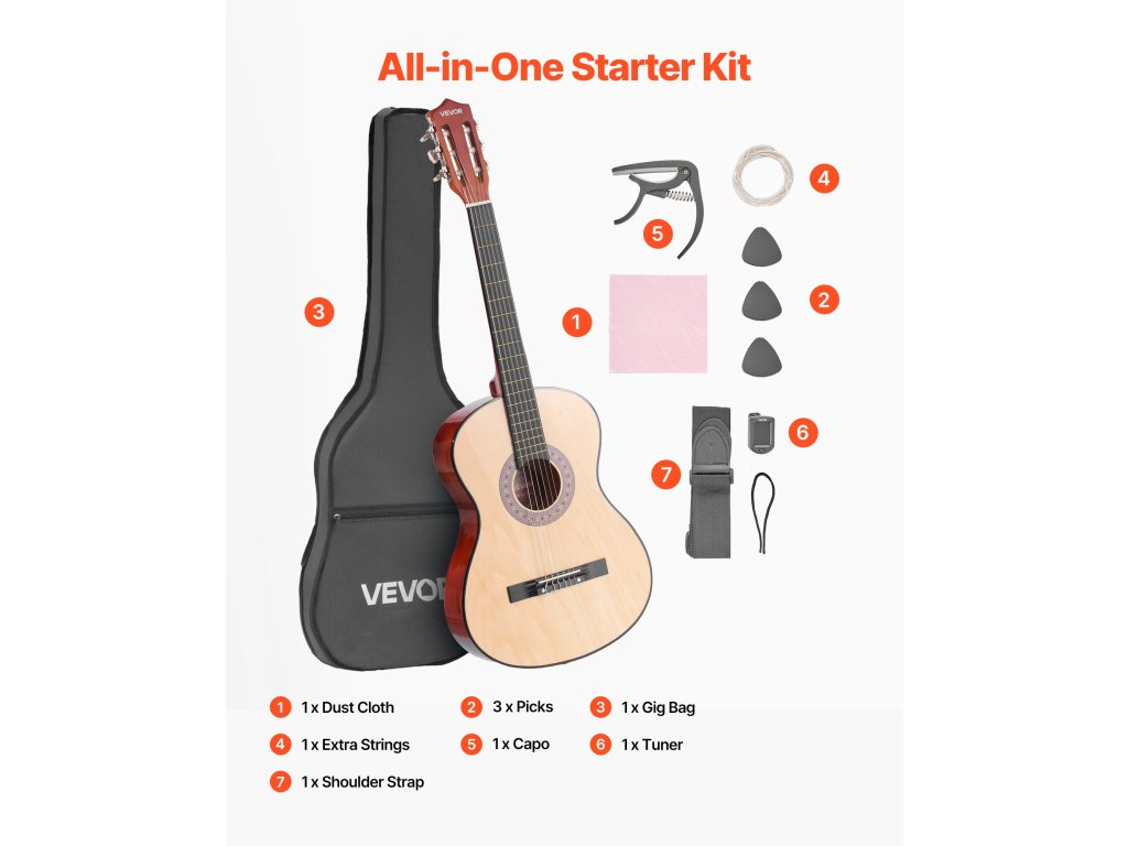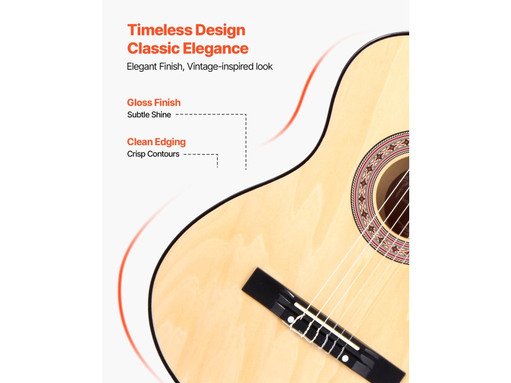 A kezdők és fiatal zenészek számára tervezett klasszikus gitár a kézzel készített minőséget és a praktikus funkciókat ötvözi. A tömörfa hátlap, a nejlonhúrok és a hangoló megkönnyíti a játékot és a hangolást. A koncert-táskával és egyéb kiegészítőkkel ez a készlet mindent tartalmaz, amire szüksége van a zenei utazás megkezdéséhez.