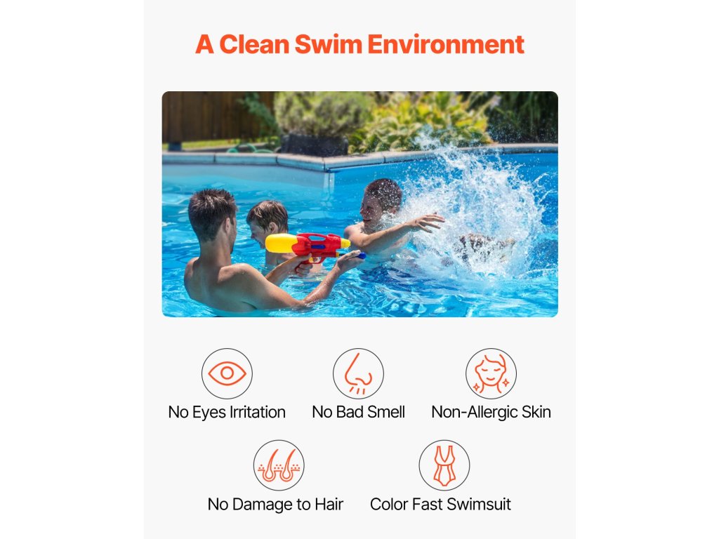 Ez a kíméletes tisztítási módszer nem irritálja a szemet, a bőrt, és nem okoz szövetfakadást és kellemetlen szagokat, mint a hagyományos klóros medencék. Kényeztesse magát egy kényelmesebb úszással, tisztább vízzel.